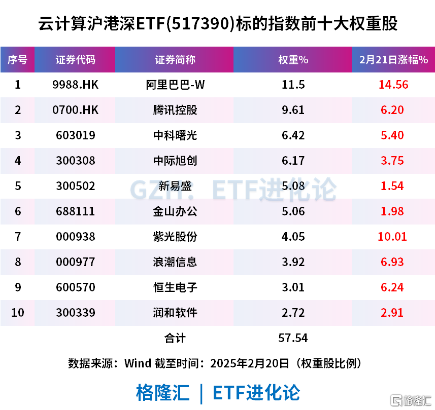 其中,阿里巴巴是第一大权重股,占11.5%,腾讯第二大权重股占9.61%,中际旭创和新易盛在“CPO三巨头”中,中科曙光在“中央企业计算能力第一股”中,金山办公、紫光股份、“国内服务器龙头”浪潮等。十大权重股总权重为57.54%。