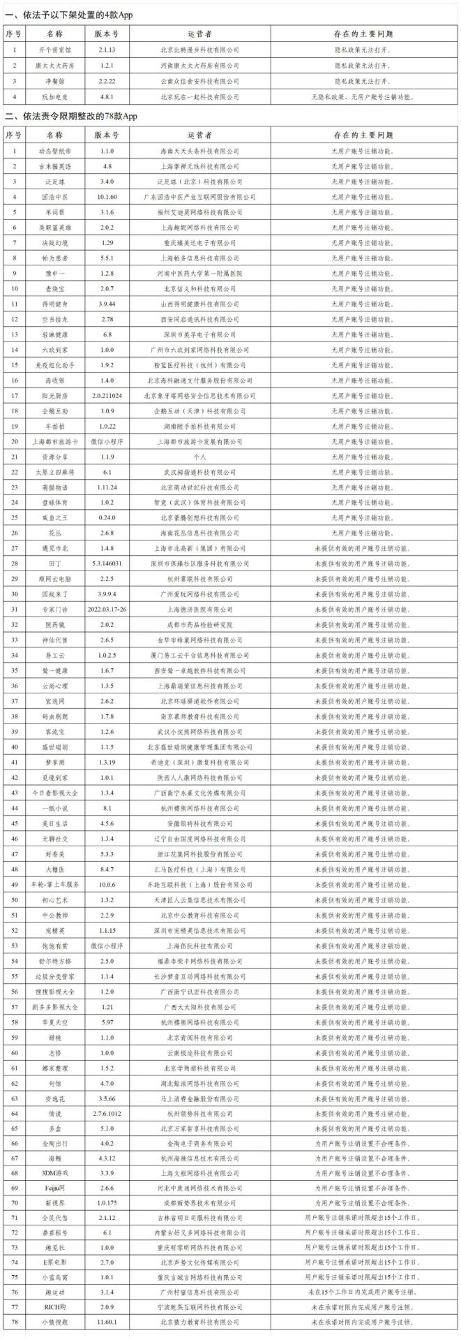 经调查,“开迷室馆”等四款应用存在未公开收集使用规则的问题,违反《个人信息保护法》等法律法规,依法依规下架;“动态壁纸帝”等78款应用未按法律规定提供删除或更改个人信息功能,违反《个人信息保护法》等法律法规,依法责令限期一个月完成整改。逾期未完成整改的,依法依规下架。