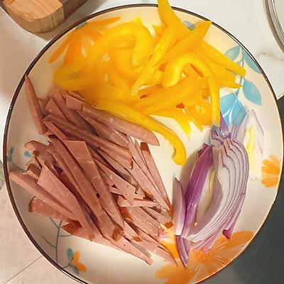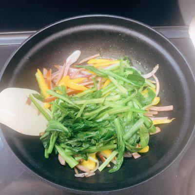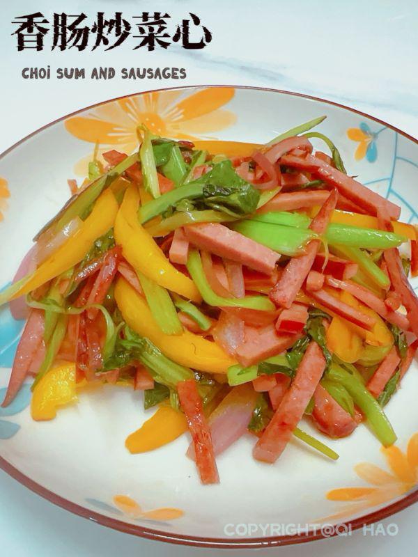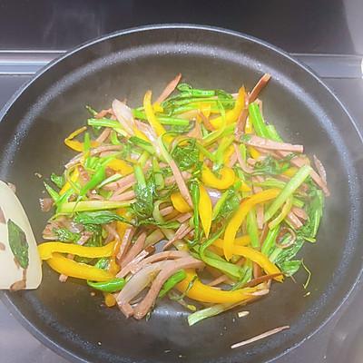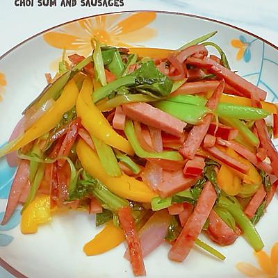 4、一个接一个地加入黄椒、香肠条和菜心,改为大火快炒。