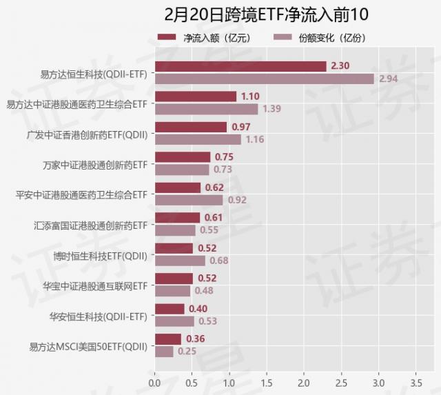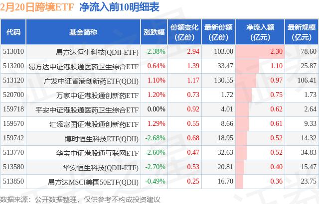 当天有 66 只跨境 ETF 资金净流入出现在基金中,其中E基金恒生科技净流入排名第一。 ( QDII-ETF ) (513010),份额增加 2.94 十亿份,净流入额为 2.3 亿元。