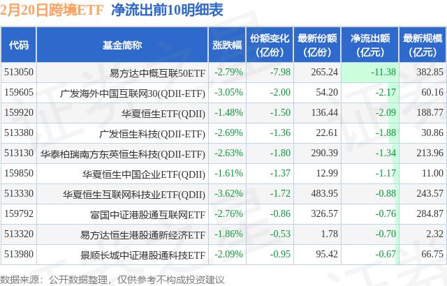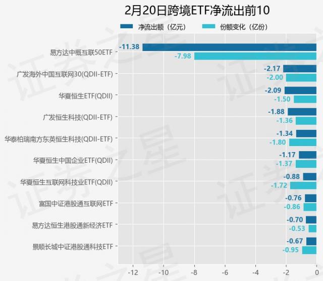 当天有 38 只跨境 ETF 资金净流出,其中易方达中概互联网在净流出中排名第一。 50ETF(513050)减少了份额 7.98 一亿份,净流出额为 11.38 亿元。