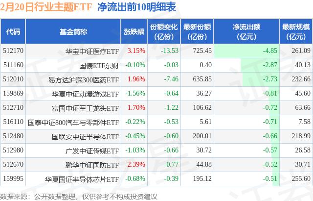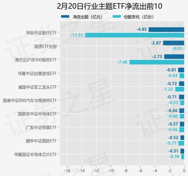 当天有 194 只行业主题 ETF 资金净流出,其中华宝中证医疗保健排名第一。 ETF(512170),份额下降 13.53 一亿份,净流出额为 4.85 亿元。