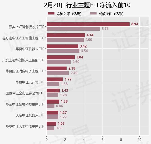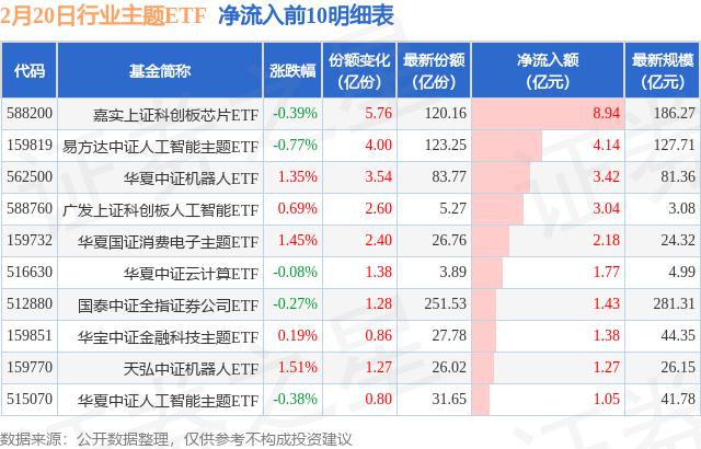 当天有 115 只行业主题 ETF 资金净流入,其中嘉实上证科技创新板芯片净流入排名第一。 ETF(588200),份额增加 5.76 十亿份,净流入额为 8.94 亿元。