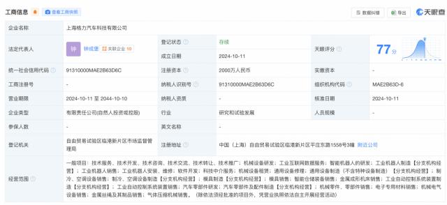 瑞财经 刘治颖 根据天眼查,10 月 11 日本,上海格力汽车科技有限公司(以下简称上海格力汽车)成立,注册资本为 2000 一万元,法定代表人是钟成堡。