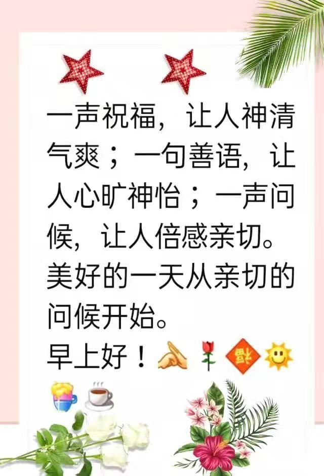 早上!温柔的问候融入了所有的愿望;淡淡的祝福倾注了无限的真诚。生活是一道风景,幸福是一种情感。在忙碌的岁月里,我们将永远珍惜这份友谊!