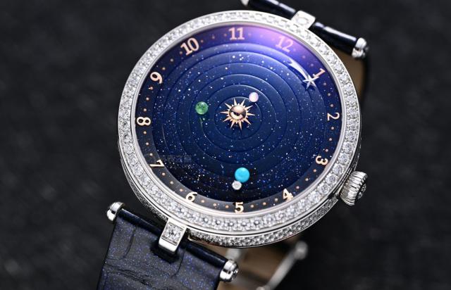 第一,它深沉的砂金石表盘不仅像浩瀚的星空,而且位于中间。 18K 玫瑰金太阳更是释放出闪亮的光芒,离太阳最近的就是由粉红珍珠母贝制成的水星,每次都会发光, 88 天空在表盘上转动;在水星之外,金星作为爱与美的化身,由透明的绿色珐琅制成,每次都会 224 天空在表盘上转动;最后,就是我们最熟悉的地球,这个由绿松石制成的蓝色星球,除了每次都会进行。 365 天空绕着太阳转一圈,也会带着裸钻和它一起生长的月球自转,所以这个闪亮的月亮每次都会发光。 29.5 天空绕着地球转了一圈,而最外面的那个。 18K 白金流星也可以实时向女士展示。 15 时间显示在分钟范围内。