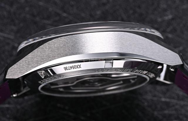我们可以清楚地看到,全新的时计使用了一个渐变表盘。制表师不是简单地涂上紫色调,而是通过从表盘边缘的深黑逐渐过渡到表盘中央呈现出丝滑的渐变黑紫色效果,从视觉上看到一种非常巧妙的烟熏效果。此外,制表师还将太阳纹磨砂饰面装饰在盘面上,提高了整体设计的立体感,可以从不同的角度展现迷人的光影效果和深邃的质感。