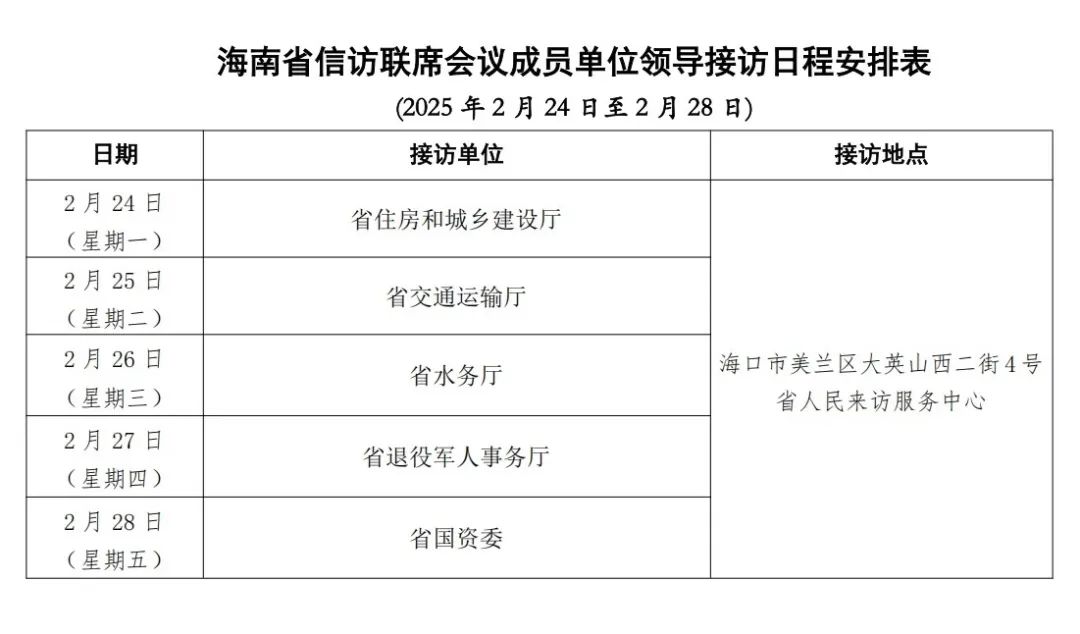2月24日至28日,海南省直属单位领导接访日程公布。详情(来源:南海网)