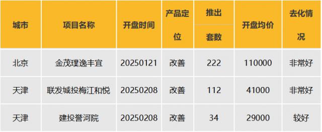 根据,2025 年 1 月 20 日 -2025 年 2 月 16 北京和天津是日华北大区的重点城市,累计开盘。 3 个,推出房源合同 368 受春节假期集中回乡的影响,推出的房源数量急剧下降。其中,改进产品热推,比例为 100%。总体而言,华北大区整体开盘数量较少,改进类项目为主,去化效果总体较好。