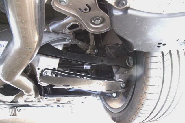 后悬是五连杆式,上下横臂均为钢制,再往里面,可以看到里边较短的支臂是铝合金材质。