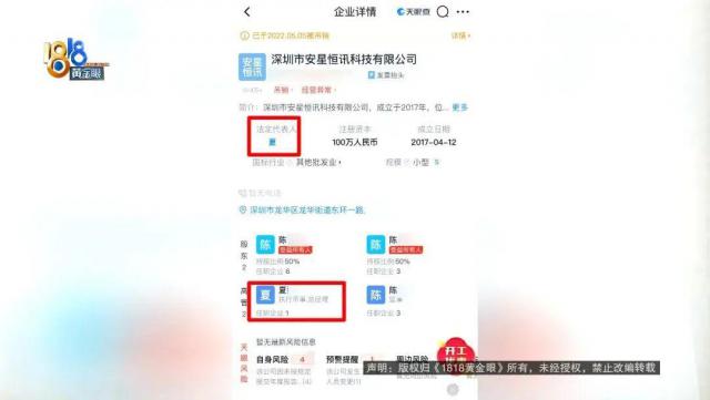 经调查,该公司名为深圳市安星恒讯科技有限公司,注册地址在深圳市龙华区。夏女士是该公司的“法定代表人”、“执行董事”和“总经理”。