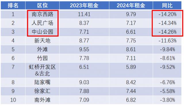 与同期相比,南京西路、人民广场和中山公园跌幅最大,跌幅超过 14%