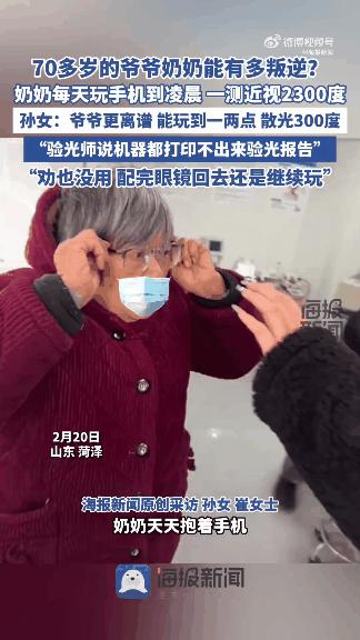 奶奶每天玩手机到凌晨近视 2300 度:2 月 20 日(报道),山东菏泽,70 几岁的奶奶每天玩手机到凌晨,一测近视 2300 度数。孙女说爷爷奶奶每天睁开眼睛就是看手机,一直玩到深夜,家人劝也劝不动,机器也打不出验光结果。