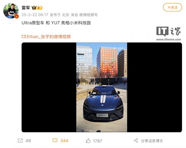 IT 世家 2 月 22 每日消息,雷军发布微博,透露小米 SU7 Ultra 原型车和 YU7 小米科技园已经亮相,昨天还有。 IT 在评论区,世家小伙伴们晒出了相应车型的照片。
