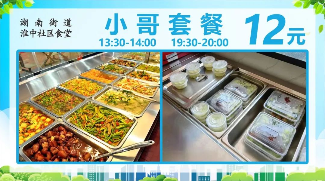 湖南街道积极整合资源,在同位于复兴西路8号的淮中社区食堂热情推出“爱心小哥套餐”,在13号。:30—14:00、19:30—20:00,只要12元就能享受到一顿便宜又实惠的温馨饭菜。据社区食堂工作人员介绍,“爱心小哥套餐”的配餐是两荤两素,根据当天的菜品现烧现配。这种专属的关怀,承载着满满的爱,为勤劳的小哥提供美味和能量。