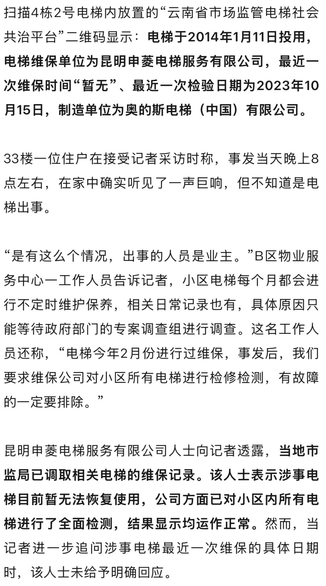 对此,昆明市市场监督管理局特种设备安全监察处工作人员表示,目前,该事件正处于调查阶段。事发当晚,小区内所有电梯都进行了紧急维修,同时,商家也到场配合。年度电梯维修计划在保证尽可能不干扰居民日常生活的前提下,提前至最近实施。对于具体由哪些部门介入调查,工作人员以“不便透露”为由,没有详细说明。