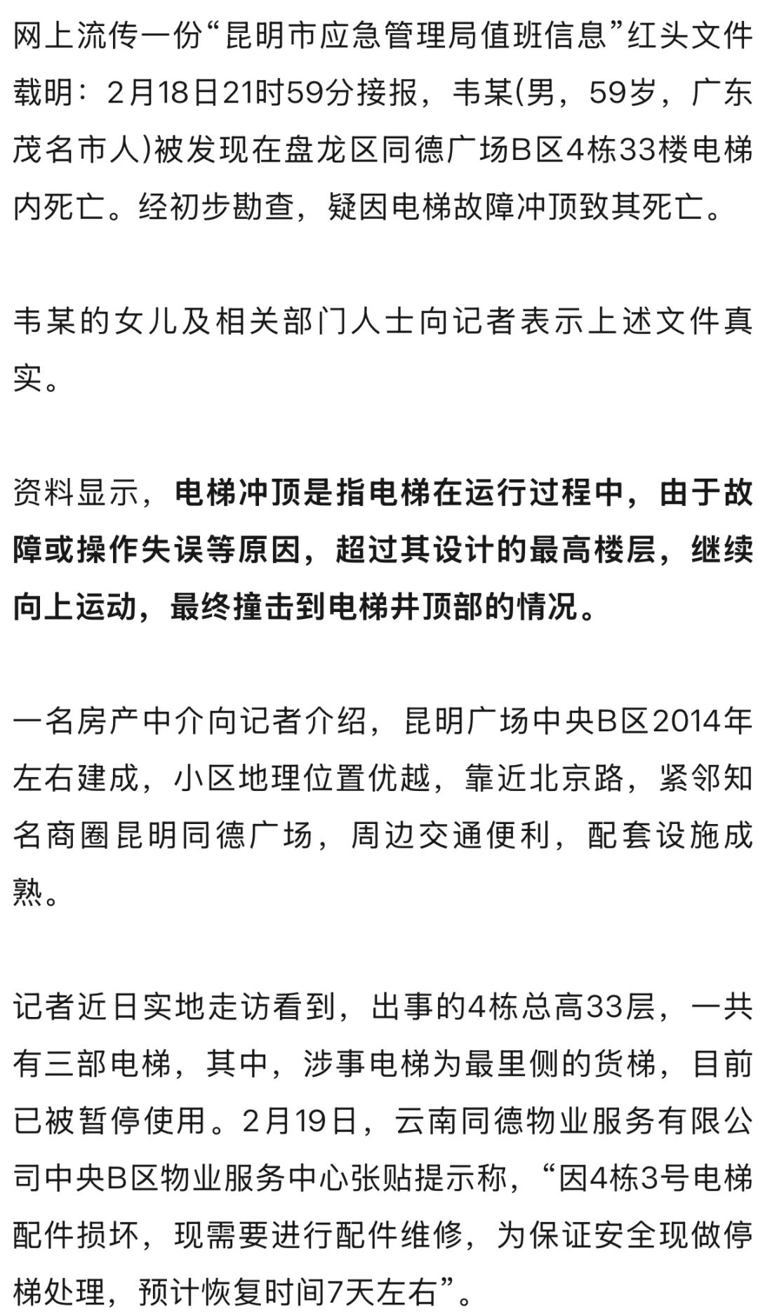 2月18日晚,59岁的业主韦某因云南省昆明市盘龙区昆明广场中央B区4栋电梯故障而死亡。