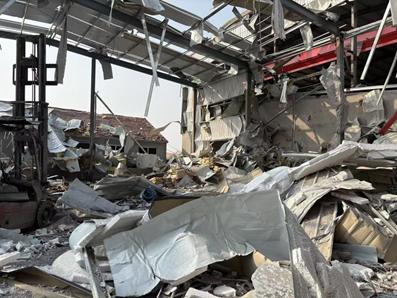 十三点六分左右,生产线爆炸,彩钢外墙和屋顶爆炸,生产设备损坏。