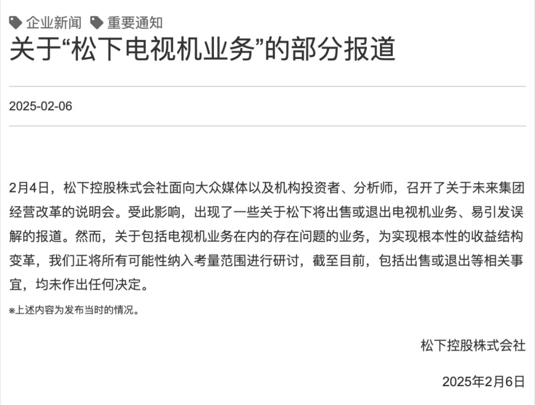 松下已宣布停止在日本生产电视,并于2021年5月将生产重心转移到海外。