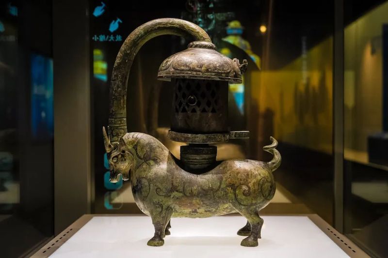东汉初错银铜牛灯,分为四个部分:插座、盘子、盖子和盖子。座位:水牛座站立,肥大,脚短,雄壮,腹空,牛头俯瞰,竖耳,瞪眼,张开嘴,向上弯曲尾巴。背部中间有一个圆形的圆孔。灯盘、盖子和盖子可以左右移动,以调节照明方向。盖子由两个弧形圆柱形组成,表面中间有一个圆形耳环,方便左右移动。墙壁中间有一个长方形的斜方形孔,盖子覆盖着碗形,顶部有一个弧形圆管通向牛头的顶部,盖子后面有一个龙头。除了盖子,整个银都是错的,图案制作精细,造型生动,设计精美。两汉时期,江苏作为刘邦的故乡,特别是徐州和扬州发展迅速,经济和手工业高度繁荣,为江苏之后的长期繁荣奠定了基础。铜牛灯是汉人富有想象力和巧妙工艺相结合的精品。
