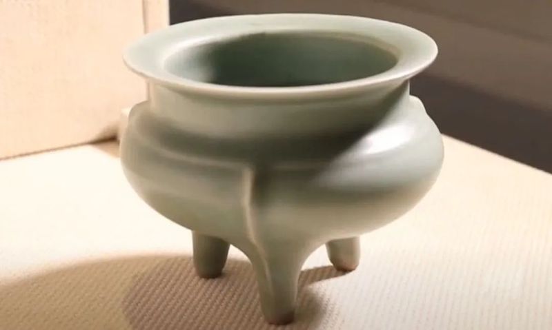 展厅里,“南宋龙泉窑梅子青蛙炉”与“清乾隆芙蓉石蟠耳罩炉”遥相呼应,两件文物大小相近,都是仿古风格。为模仿商周时期黄铜风格而制作的南宋龙泉窑梅子青蛙式炉,在宋至明时期盛行。整体施青釉,釉色淡雅温和,如梅子初青,造型古朴典雅,具有稳重感。该装置与清乾隆芙蓉石蟠耳罩炉被公众称为“小粉炉”和“小青炉”,成为网友口中的“小粉炉”CP”。