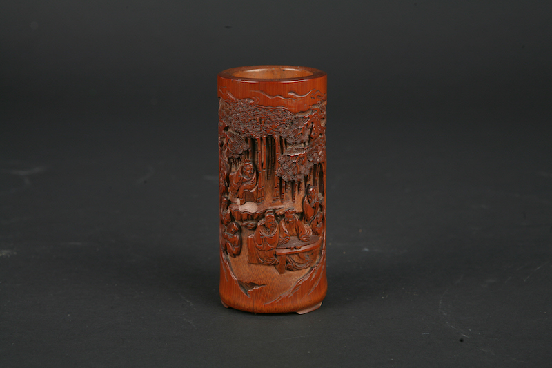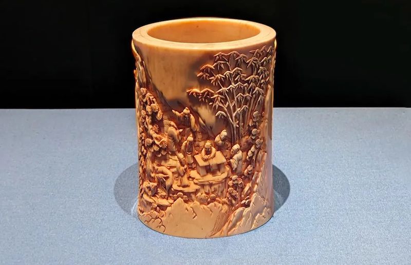 清象牙雕竹林七贤士笔筒是关于文房的宝藏。这个笔筒是象牙做的,模仿江南嘉定派竹雕的深度浮雕,描绘了七贤在青松草坪竹林之间游玩的场景,是苏派牙雕的巅峰。