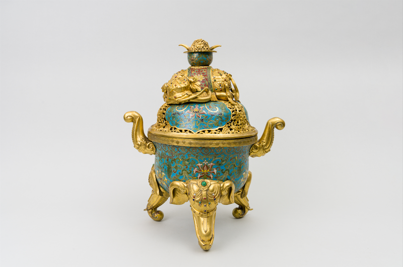 清代中期,丝绸珐琅镀金太平有象熏炉采用丝绸珐琅的工艺,是元朝传入中国,明代景泰时期金属制作技艺兴盛的一种。这个熏炉的设计灵感来源于“象扛宝瓶”,代表着“和平有象”,象征着和平、丰收和美好的场景。在中国文化中,“大象”往往被视为野兽和长寿的象征,所以这个熏炉也承载着吉祥美好的寓意。