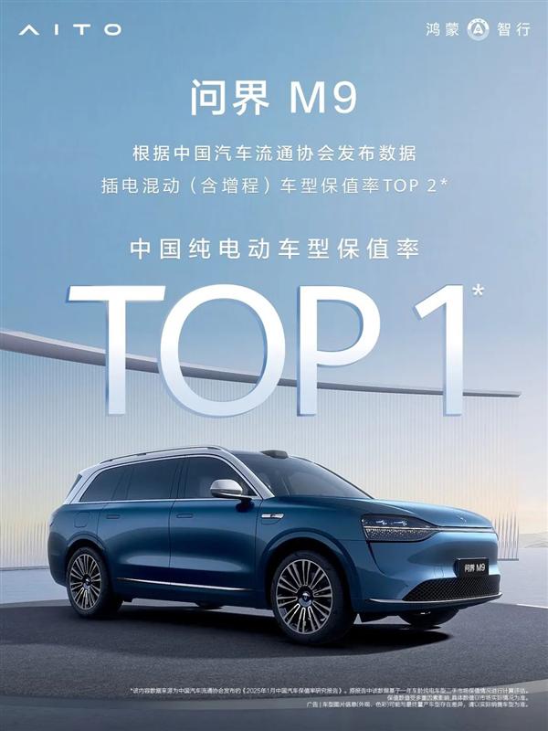 五十万级豪车标杆!问界M9登顶中国纯电动汽车保值率第一