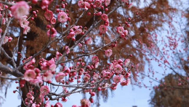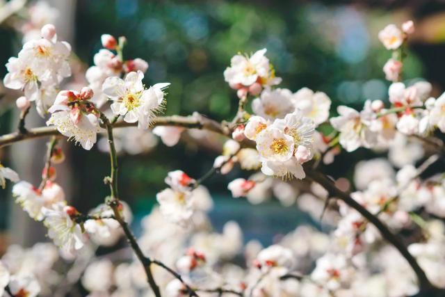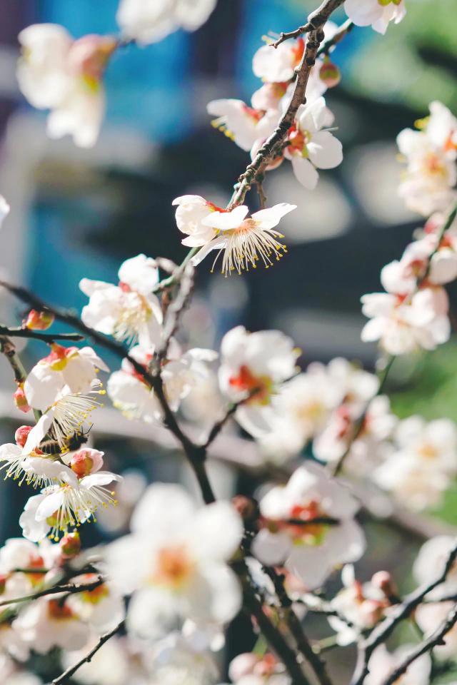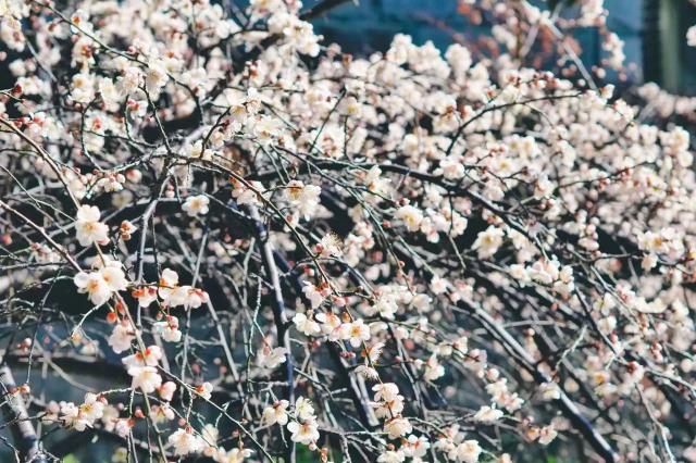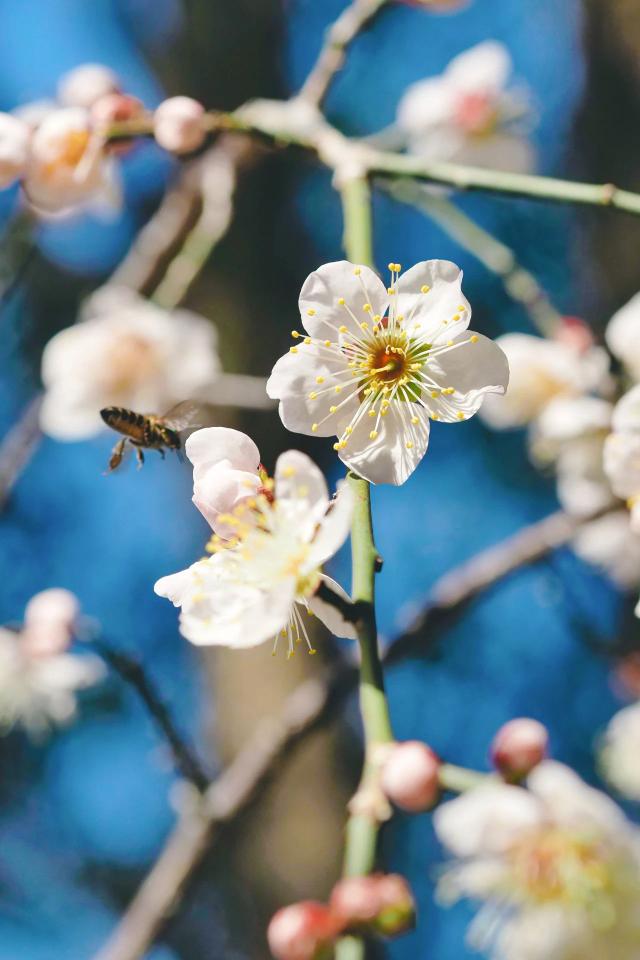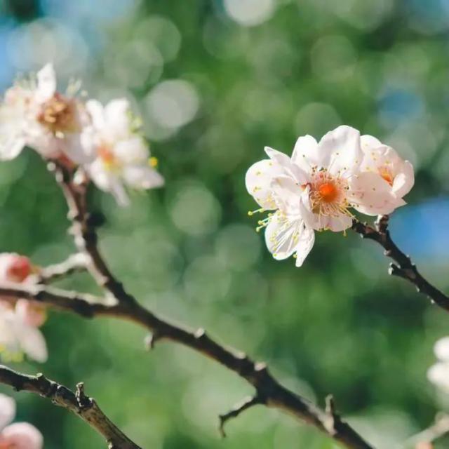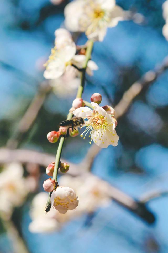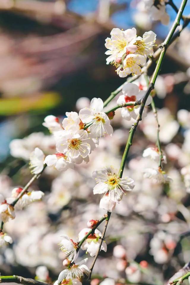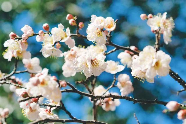 “梅须逊雪三分白,雪却失去了梅香。”晴空下的白梅简单优雅。赏梅时,放慢脚步,静静地感受梅花的形状、香味和周围环境,感受沁人心脾的美好。