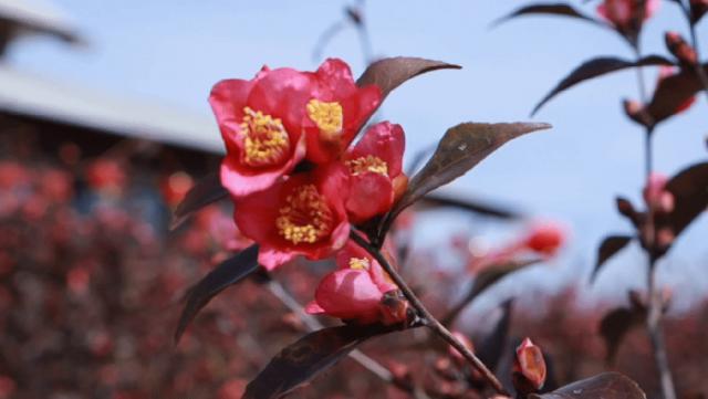 "丹砂点雕蕊,月独含苞."茶花花瓣茂盛,或红如火,艳丽而炽热,与红梅相得益彰,共同点亮初春的景色。