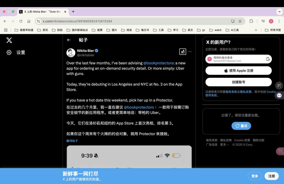 Protector 热度在上升。前几天,前几天, Meta 产品经理 Nikita Bier 在 X 上发帖推荐 Protector,并把它称为「带枪的 Uber」,「假设你这个周末有个火热的约会对象,那就用吧。 Protector 去接她。」