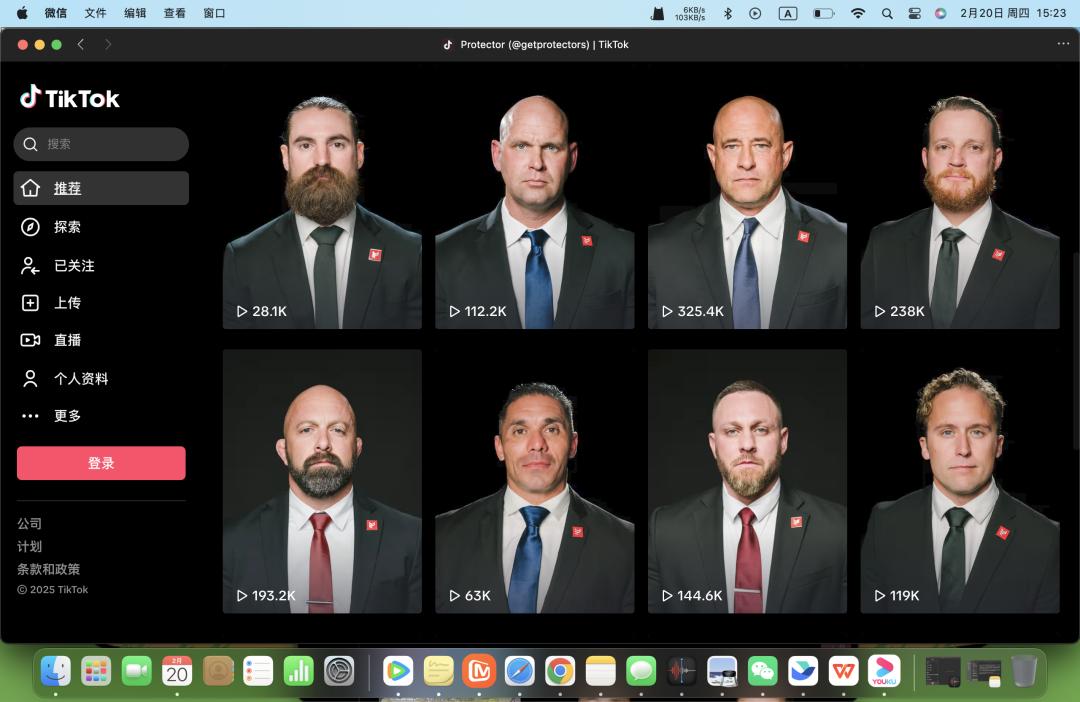 Protector 的社 媒体宣传也很引人注目。 TikTok 帐上,可以看到一系列身材魁梧的保镖,坐在黑色背景前,一脸严肃地展示自己的证件和经历, 这类保镖的出现看起来非常安全,「潜在威胁」看起来也是一种震撼。