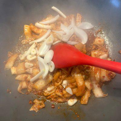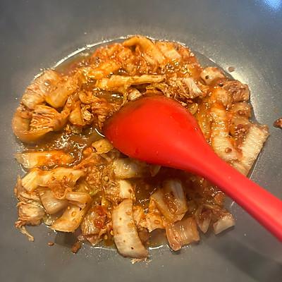 5、加入辣白菜翻炒,最好是醇厚的,酸辣白菜最好是辣白菜。