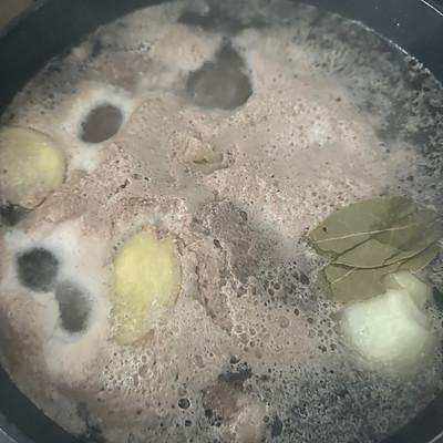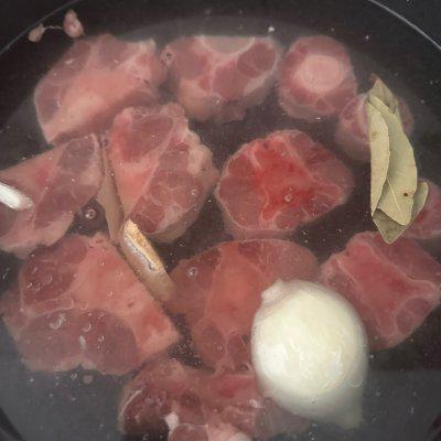 1、将牛尾冷水放入锅中,加入姜片、米酒、香叶和葱花