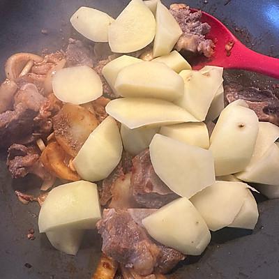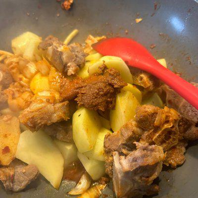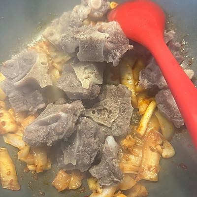 7、将炖牛尾放入炖牛尾继续炒匀。