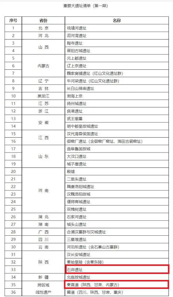 全国共有人(第一期)通知中公布的重要遗址清单 36 名单上有五个遗址,陕西名单上有五个,其中榆林有两个,分别是石头遗址和秦直道(陕西、甘肃、内蒙古),涉及很多地方。