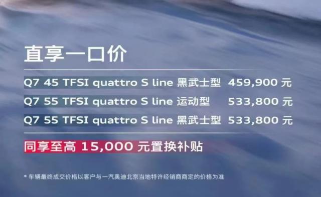最近几天,"奥迪 Q7 全系车型直接享受一口价政策,其中 45 TFSI quattro Sline 黑色武士版的价格低至 45.99 “一万元”的消息传开了,但是在媒体走访之后,发现这个价格需要贷款买车才能达到,全款买车的裸车价格 51 万左右。