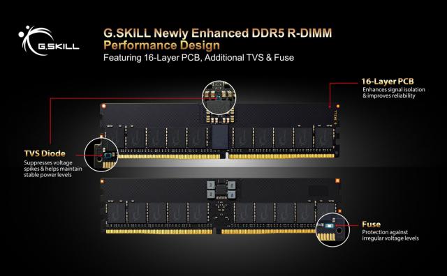 芝奇(G.Skill)宣布,推出强化型 DDR5 R-DIMM 内存,专为企业服务器和专业工作站设计,在性能和保护方面取得了突破。这是基于 JEDEC 最新发布的 DDR5 R-DIMM 修改标准,使用 16 层 PCB,在新的瞬态电压抑制的同时,提高了信号的完整性。(TVS)二极管和保险丝改善了过电流保护,防止静电放电。(ESD)。