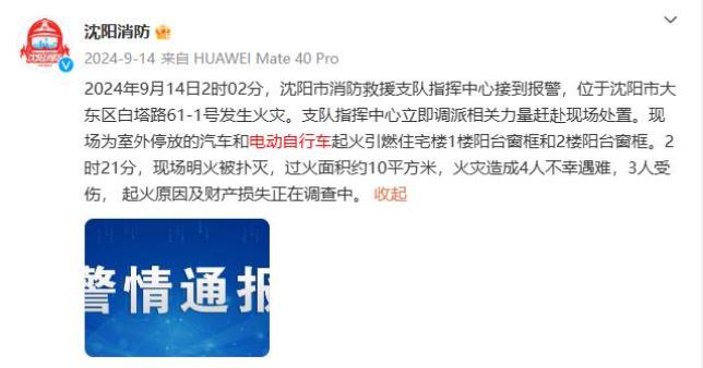 2024年9月14日1时59分,停放在辽宁省沈阳市大东区白塔路61-1号单元门口的汽车、电动摩托车、电动自行车发生火灾,点燃建筑物易燃可燃外保温材料和住宅楼一楼和二楼阳台窗框,造成4人死亡,3人受伤,25人成功疏散。经过调查,火灾原因是锂电池热失控,高温飞溅物点燃车身及附近的可燃物质。火灾发生时,热烟迅速蔓延到模块走廊,因为单元门没有关闭。三个人在逃跑过程中吸入了太多有毒的烟尘,在楼梯台阶上窒息而死。一个人在逃跑过程中严重烧伤,被送往医院治疗无效后死亡。