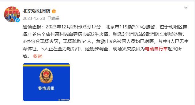 2023年12月28日3时17分,北京市朝阳区崔各庄乡东辛店村一栋五层民用电动自行车发生火灾,造成4人死亡,9人受伤(其中5人受重伤)。经调查,火灾原因是停在入口门外的电动自行车在充电过程中出现电池故障,点燃了入口门上的纯棉窗帘,烟尘沿着楼梯扩散到楼内通道,导致楼内四人逃生疏散时吸入大量有毒烟尘窒息死亡。