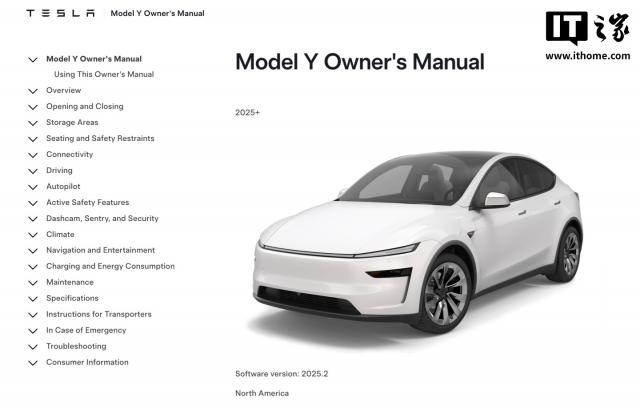 现在,消费者可以在特斯拉官方网站上查看新款 Model Y 完整的车主手册。然而,老款 Model Y 车主手册链接页面在 IT 在写这篇文章的时候,世家似乎无法打开。