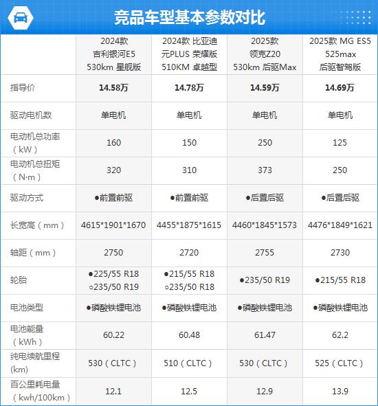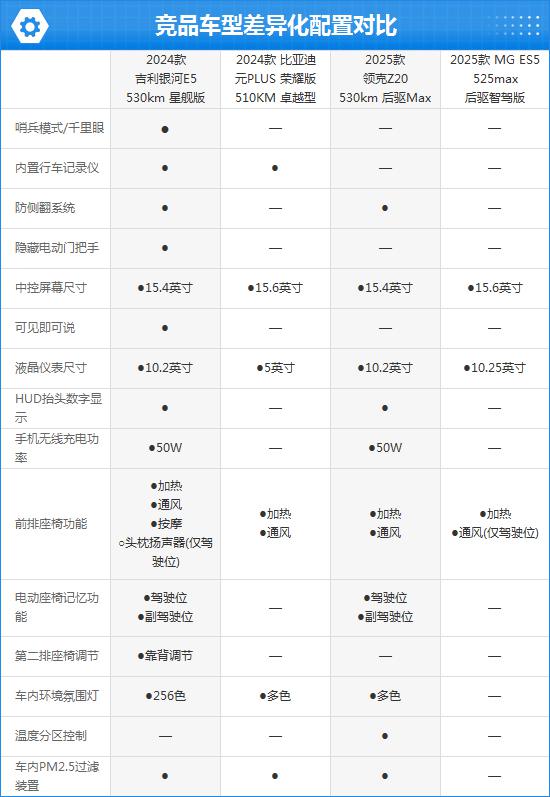 相对于竞品车型,2024 款吉利银河 E5 在 CLTC 纯电续航里程方面与领克 Z20 性能一致,比其他两款车型都要长一些,但是优势并不明显。然而,出色的配备表现使吉利银河 E5 直接“超车”,尤其是在舒适性方面,专属于前排座椅按摩和第二排座椅背部调整,还提供了隐藏式电动门把手和可见的功能,可以为驾驶员和乘客提供更好的用车体验。