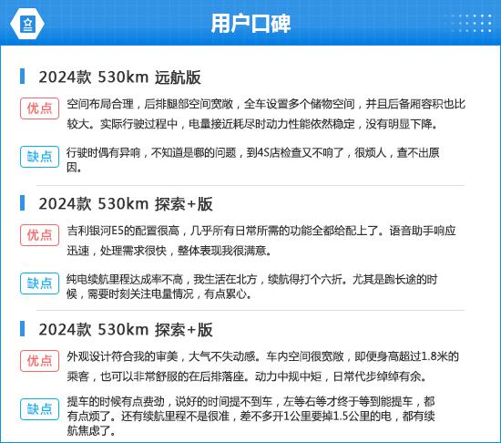 大多数消费者在用户口碑中, 2024 款吉利银河 E5 空间、设计、动力、配置都令人满意,但也有消费者表示,驾驶过程中偶尔会出现异常噪音、续航里程不准确、未按约交付等问题。