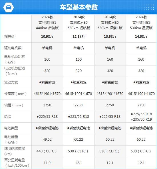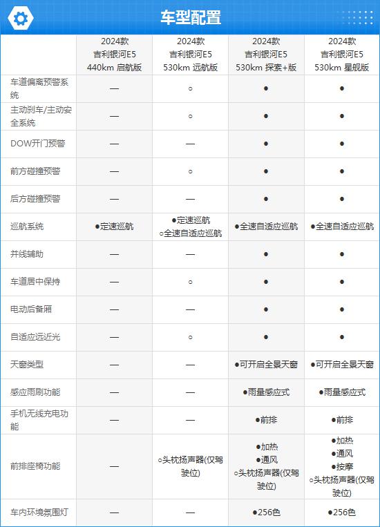 通过配置对比发现,2024 款吉利银河 E5 标配外置单电机,提供两种容量电池组,纯电续航里程分为 440km 和 530公里。配置方面,入门级车型略显寒酸,舒适性、智能性、主要性、 / 只有在中高配车型上才有被动安全配置。