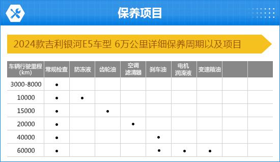 2024 款吉利银河 E5 整车保修为六年或六年 15 万公里(以先到为准),第一个车主可以享受无限年限的三电系统。 / 里程保修政策(限于非营运车主,免责条款以官方为准)。保养方面,3000-8000 第一次检查车辆需要在公里内进行,包括制动系统、轮胎、线路、电驱动系统、动力电池等。,并在后续的每一次维护中进行常规检查。另外,需要防冻液 10000 在公里内更换;机油是 15000 公里;空调器滤清器为 20000 第一次制动液,公里; 40000 每公里更换一次,然后每一次 20000 每公里更换一次。电动机润滑剂和变速箱油都需要 60000 每公里更换一次。