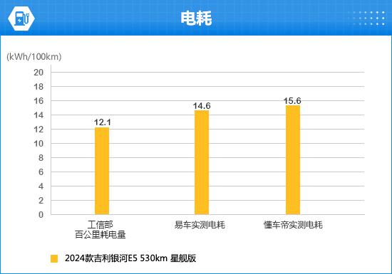 根据工业和信息化部的申报信息和各大汽车垂直媒体的测试数据,2024 款吉利银河 E5 530km 工信部星舰版百公里用电量为 12.1kWh/100km,易车与懂车帝网站实测用电量分别为: 14.6kWh/100km 和 15.6kWh/100km(数据仅供参考)。