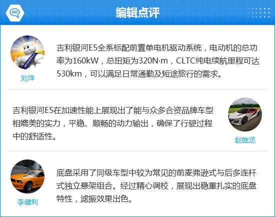 动力装置方面,2024 款吉利银河 E5 配备外置单电机,总功率 总扭距160kW 320N · m。与之匹配的传动装置是固定齿比变速箱,CLTC 根据车型版本的不同,纯电续航里程分为 440km 和 530km。