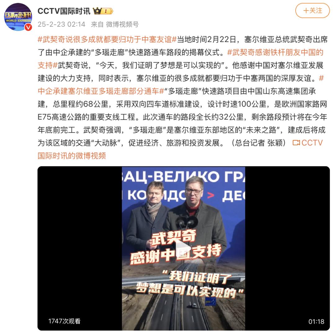 塞尔维亚总统武契奇于当地时间2月22日出席了由中企承建的“多瑙走廊”高速公路路段揭幕仪式。“今天,我们证明了理想是可以实现的”武契奇说。在此基础上,他感谢中国对塞尔维亚发展建设的大力支持,并表示,塞尔维亚的许多成就都归功于中塞两国的深厚友谊。“多瑙走廊”高速公路项目由中国山东高速集团建设,总里程约68公里。它是欧洲中国路网E75高速公路的重要支线工程,采用双向四车道标准,设计时速100公里。通车路段总长约32公里,预计今年年底前将完工剩余道路。武契奇强调,“多瑙走廊”是塞尔维亚东部的“未来之路”。建成后,它将成为该地区的交通“主动脉”,促进经济、旅游和投资的发展。