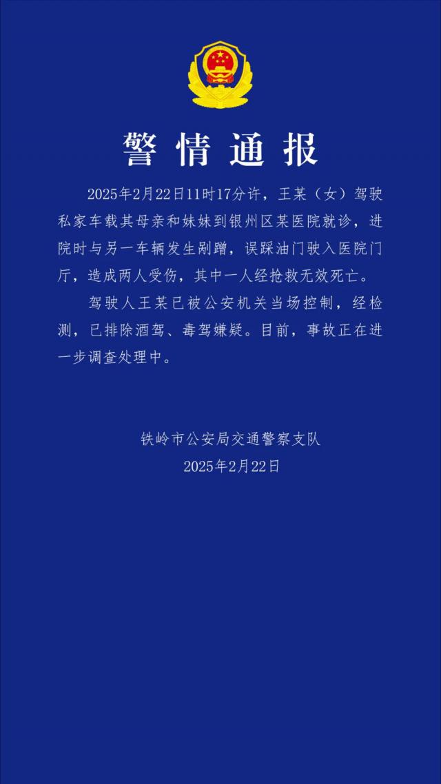 2 月 22 日 11 时 17 分许,王某 ( 女 ) 开着私家车带着母亲和妹妹去银州区的一家医院看病。当他们进入医院时,他们与另一辆车发生了碰撞。他们误给油进入医院门厅,造成两人受伤,其中一人因抢救无效死亡。