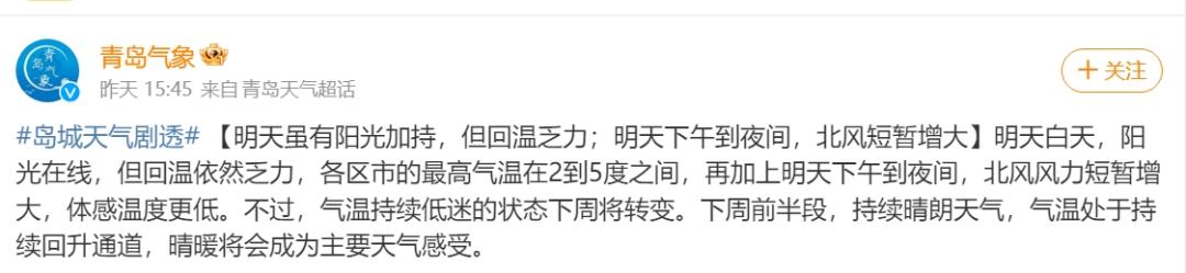 另外,从@青岛气候来看 据悉,今天下午至晚上,北风风速短暂增大,体感温度较低,大家出行时要注意保暖。